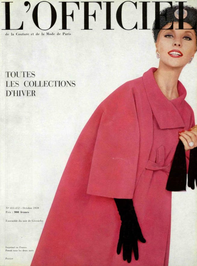 Created for Givenchy’s Autumn/Winter 1959 collection, this design had always been on my radar. It was one of the more highly publicised pieces from this particular season, featuring on the cover of L’Officiel magazine, sketched in Vogue, photographed by Seeberger, and even copied in America by the department store Macy’s for $129 (nearly $1,500 today). So when the opportunity to purchase it came along, my hands were essentially tied - what choice did I have?